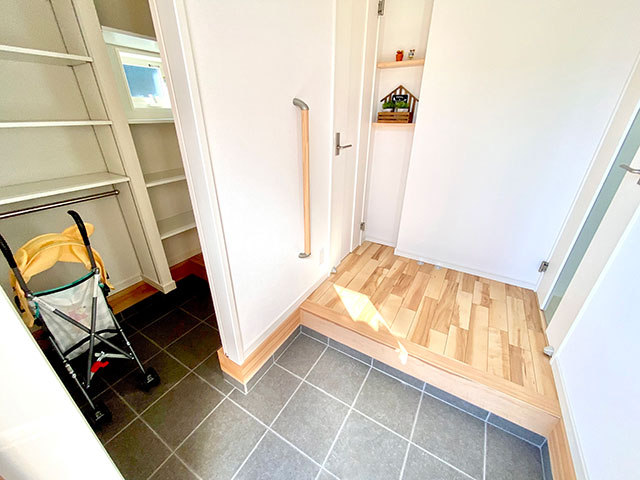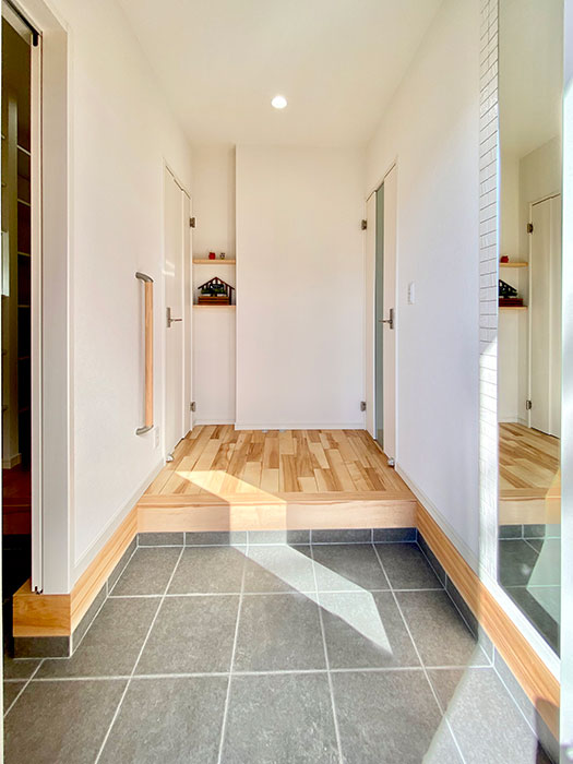 ホワイトを基調とした清潔感のある玄関。全身鏡と手すりは標準搭載です。玄関の飾り棚にアルコールスプレーを置けばウイルス対策もばっちり。