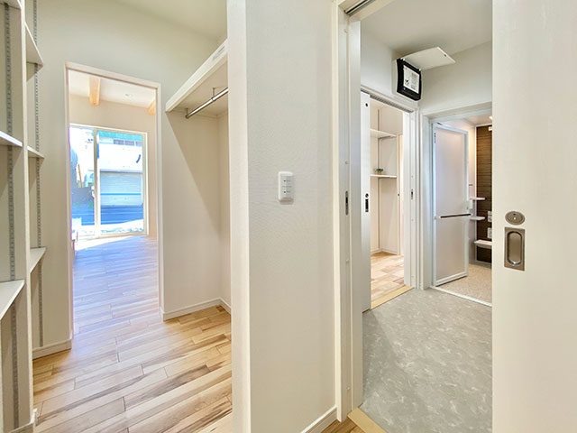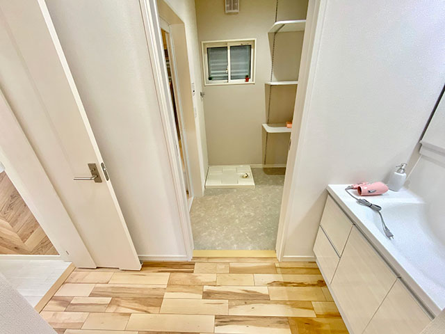 洗面から脱衣室、その先にファミリークローゼットがあります。