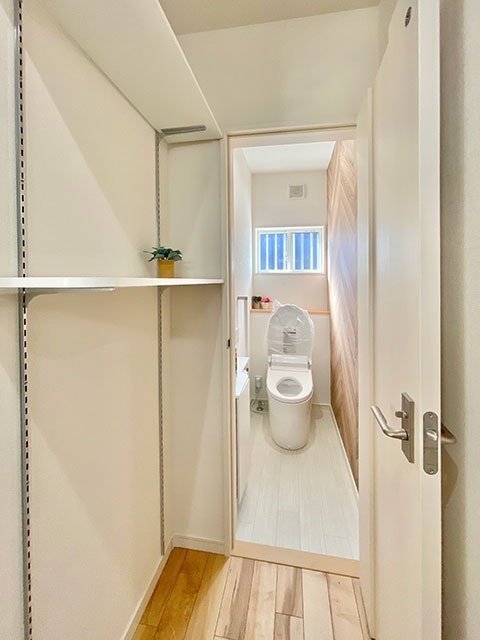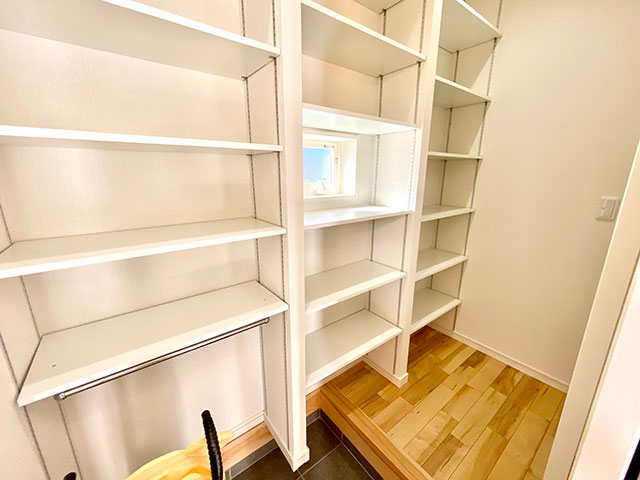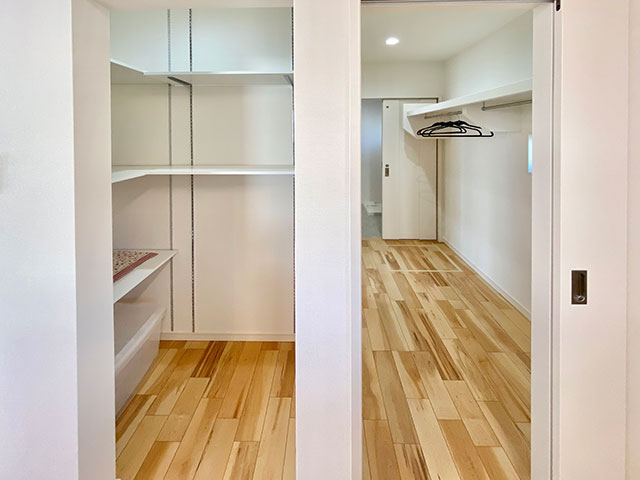 このお家は収納が各所に設けられているので収納には困りません。キッチンから水まわりへいく家事動線も確保しました。