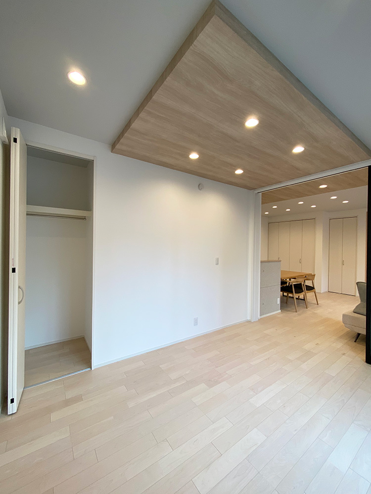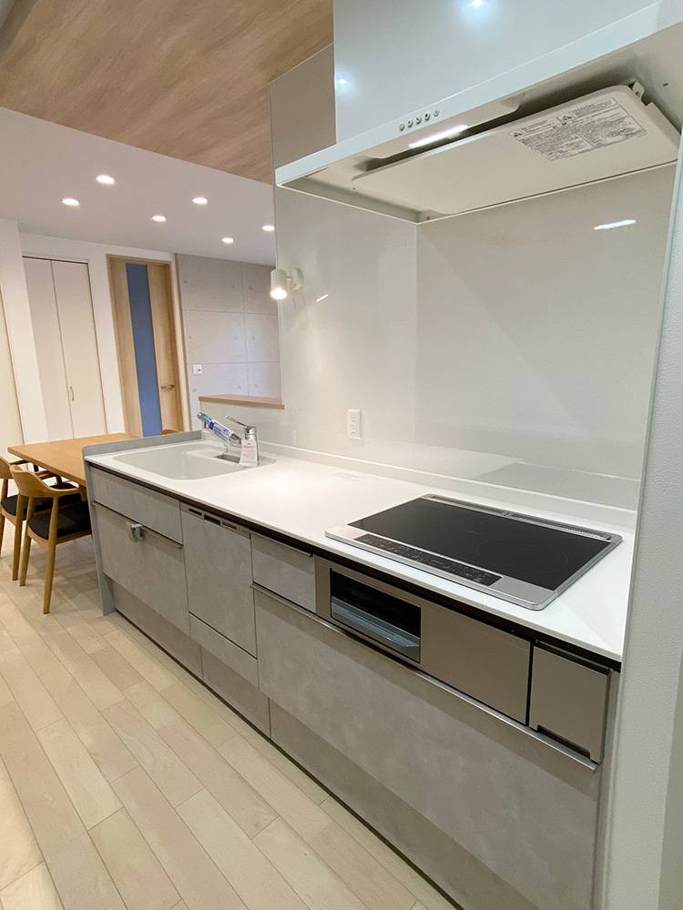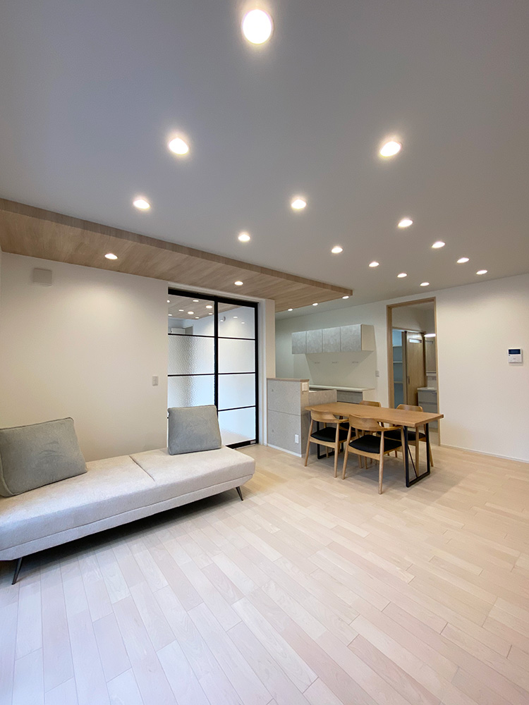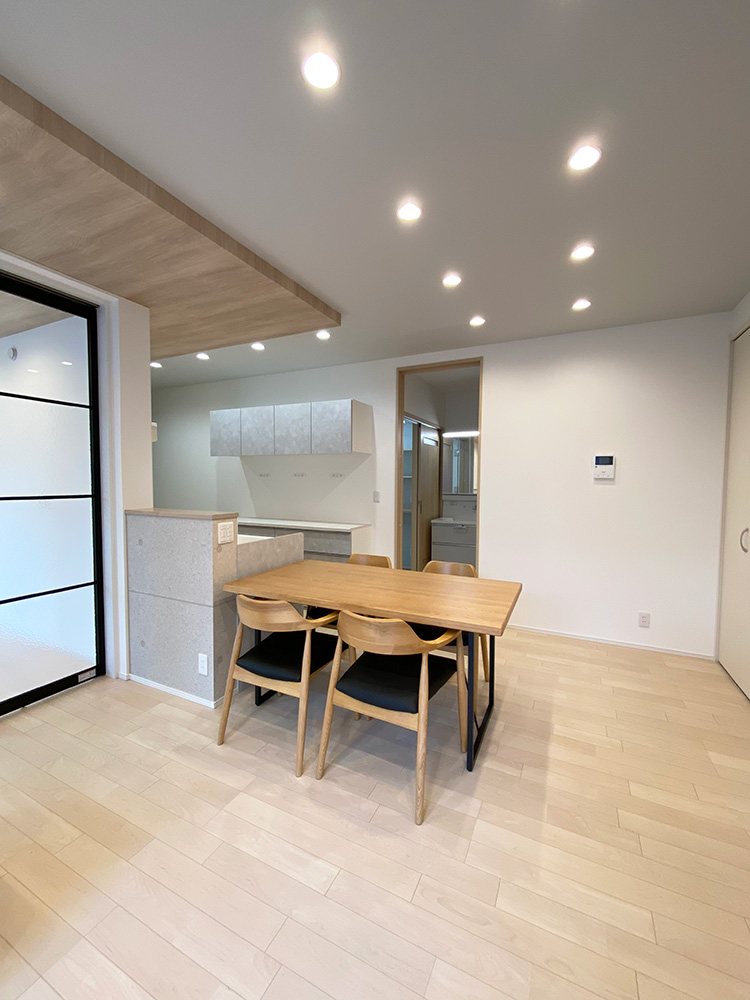 明るめの「グレイッシュ」に建具の木地色をアクセントとした空間に仕上がりました。