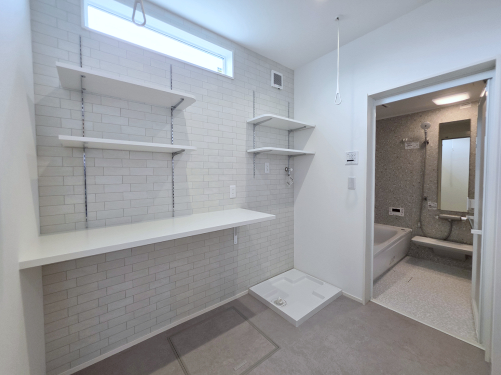 洗う・干す・畳むまで完結できちゃう空間は、明かり取りの窓や室内物干し、50㎝あるカウンターや棚で充実しています。
