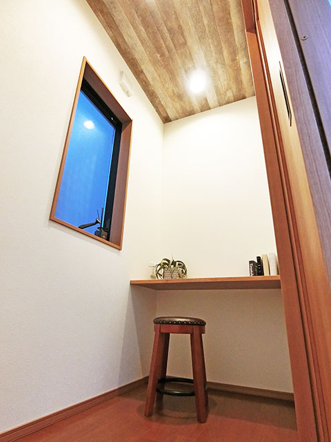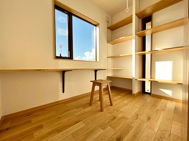 こちらは、カウンターとイスだけの非常にシンプルな1.6帖の書斎です。zoom会議など背景が気になる時や、集中して読書をしたい時にピッタリ!リビングの隣にあるので、ゆるく家族と繋がれるところもポイントです。
