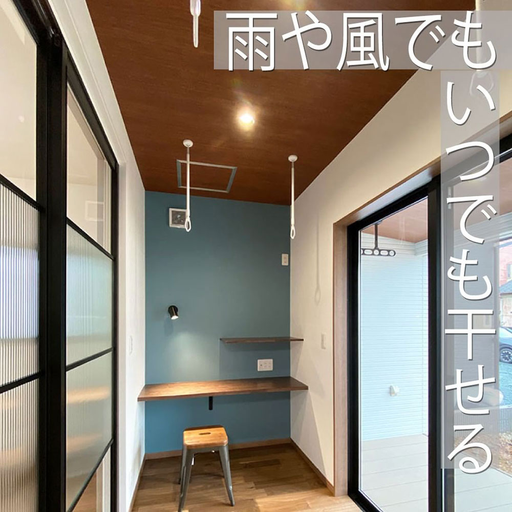 サンルームのある家サンルームのいいところ雨の日洗濯室内干し花粉症紫外線対策ワークスペース家事ハンガー干し注文住宅を超える建売