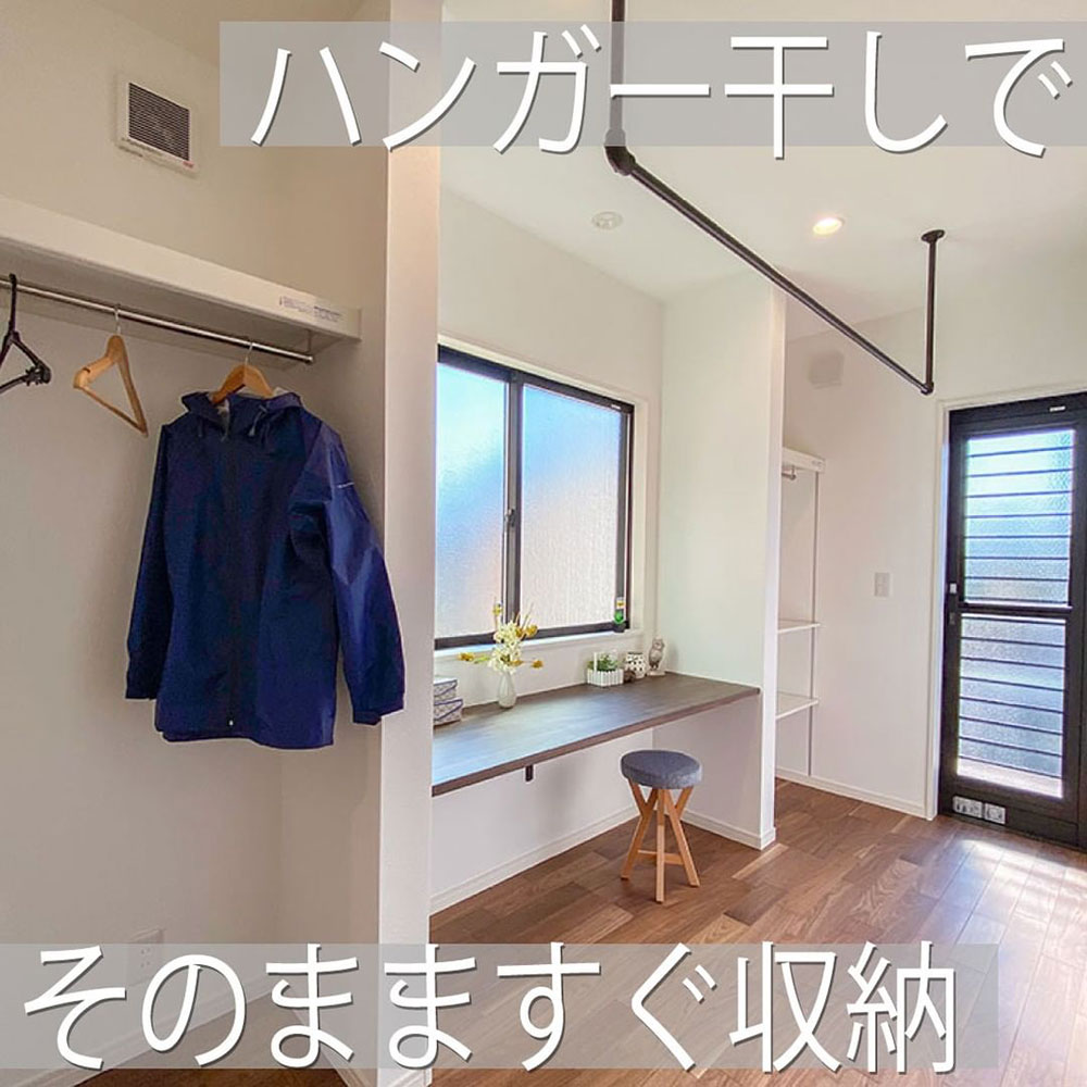 当社の間取りは収納豊富+サンルームの近くにファミリーCLをつくっていることが多いため、サンルームで干した洗濯物をそのままファミリーCLに掛ける収納ができちゃいます。