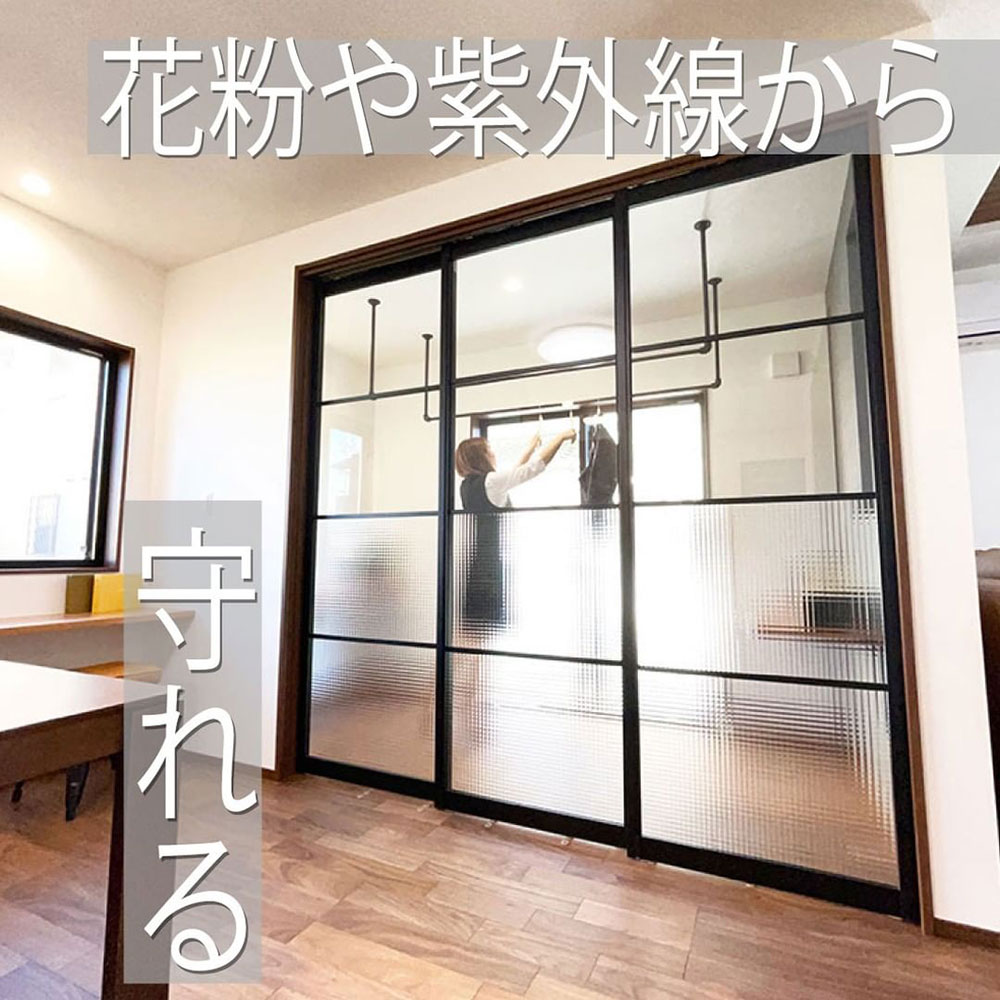 花粉などのアレルギーを持っている方は、外に干したい気持ちはあっても室内干しになってしまいますよね。日当たりは確保しながら外の空気には当てずに干せるのがサンルームの魅力。また当社の分譲住宅は窓ガラスに防犯合わせ複層ガラスを採用しているため、防犯機能はもちろん、紫外線からお洋服を守ることもできちゃいます。