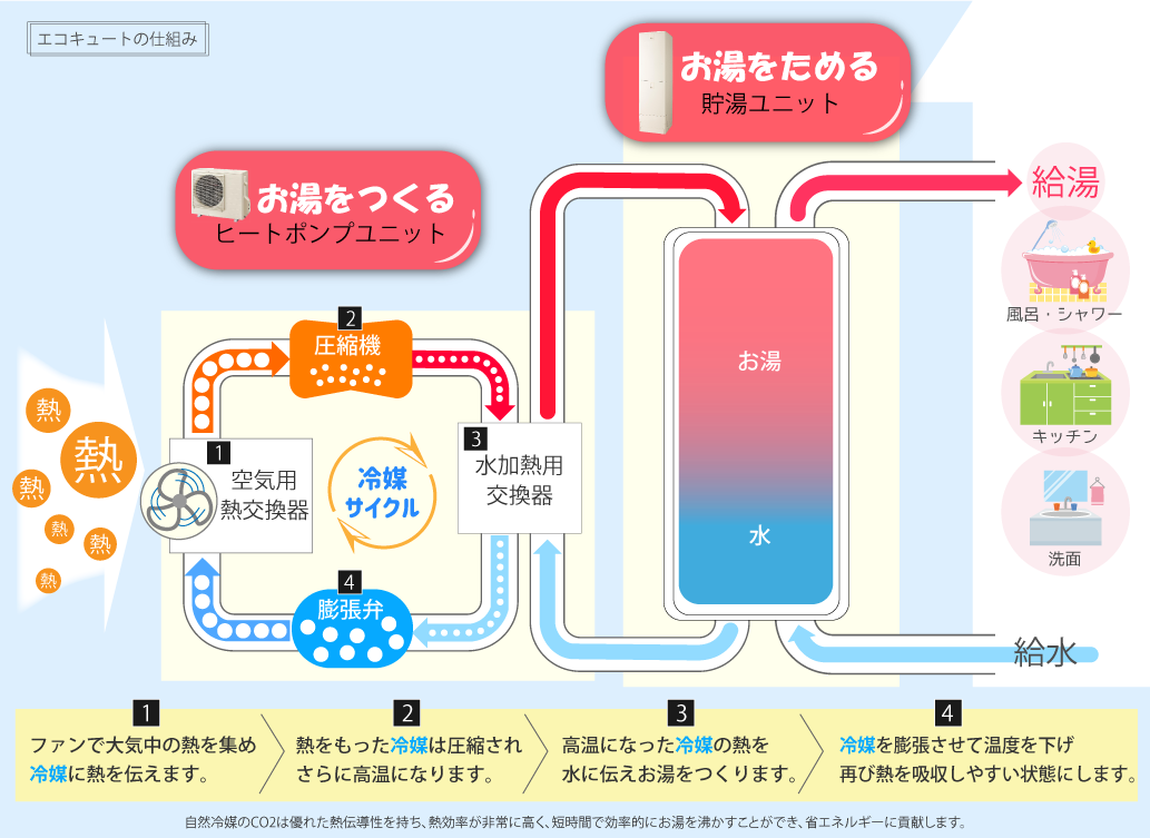 エコキュートは、従来の電気温水器に比べて省エネ性に優れた温水器です。