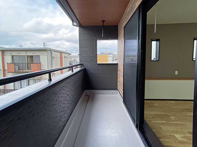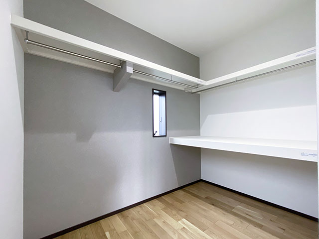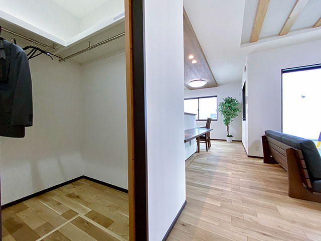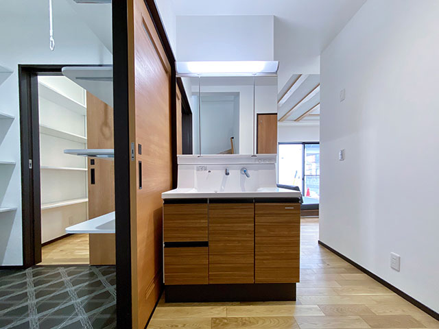 洗面脱衣室を別々に配置しているので気兼ねなく使うことができます。脱衣室には室内物干し付き!
