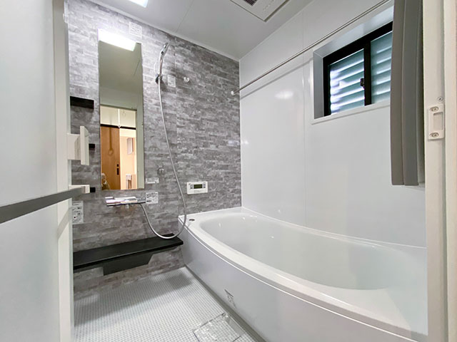 乾きやすく・カビにくくお手入れがラクな床に断熱材で包み込んだTOTOの魔法びん浴槽。浴室換気暖房乾燥機付き。