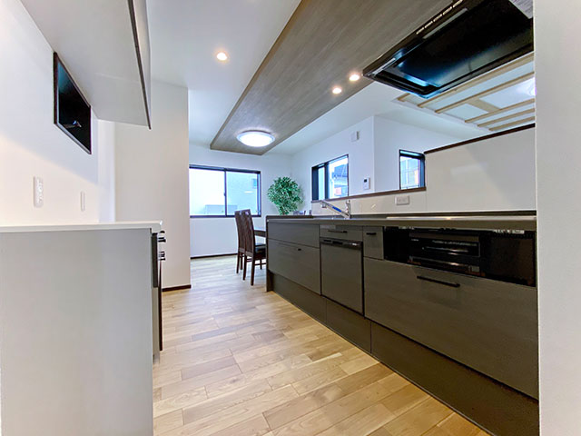 後ろのカップボード、右側にはパントリーがあるので食品や調味料の収納には困りません。