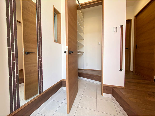 全身鏡と手すりのついた玄関(エントランス)。2通りの動線を確保しました。