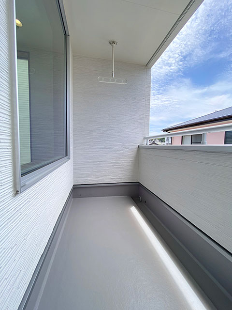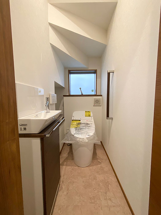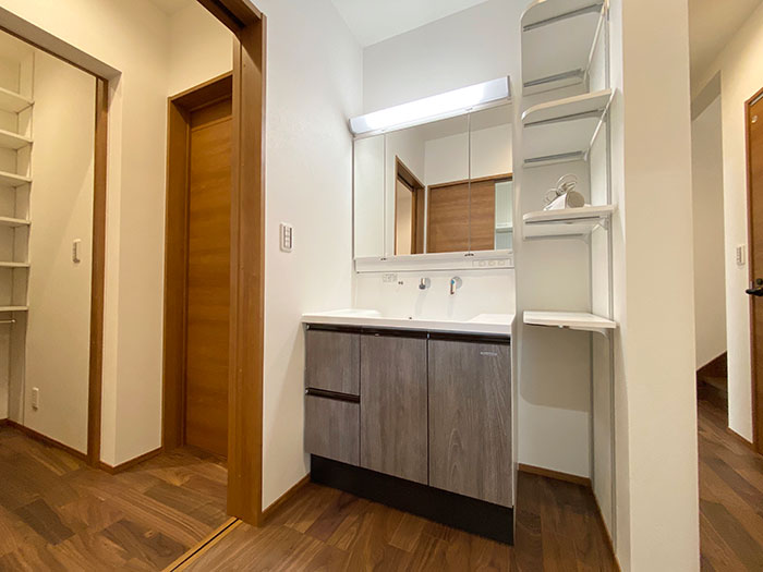 玄関からすぐのところに洗面化粧台を配置しました。ここで手洗いうがいをしてリビングに行くことで生活空間を清潔に保つことができます。