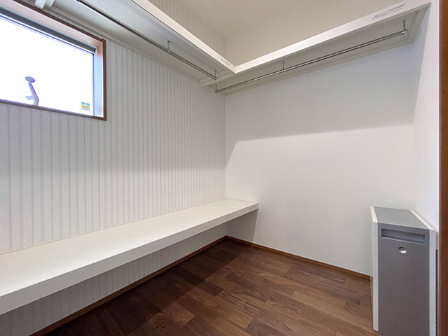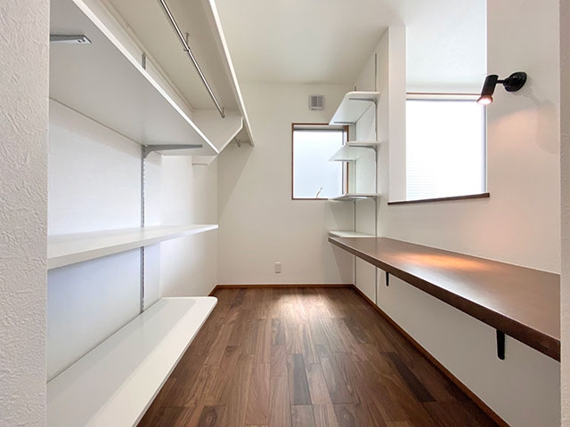 1階にある2.5帖のファミリーCL。掛ける、置く、たたむ収納が集約されています。玄関の横にあるので便利です。