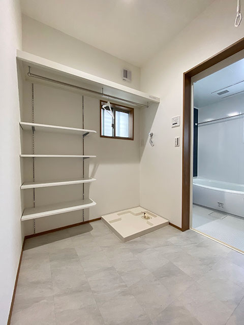 すぐにお風呂に入れるようにパジャマやタオルが収納できる棚を配置したランドリー。