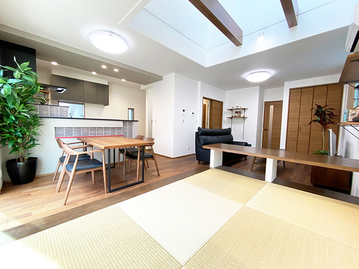 和コーナーに寝転がると上が吹き抜けになっており、開放感があります。カウンターがついているので宿題や作業もできます。