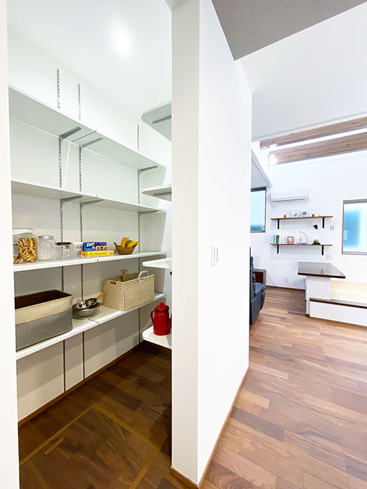 奥行きのあるパントリー。上まで棚になっており、下には床下収納があります。