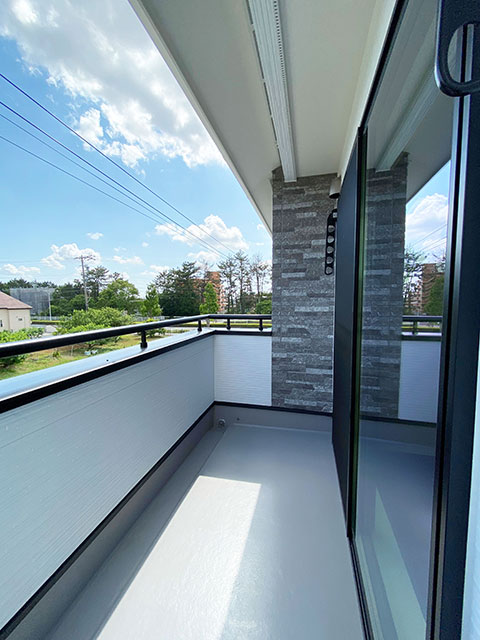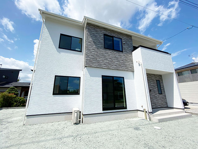 白い外壁にダークグレーの石目調の外壁をアクセントにした重厚感ある外観。