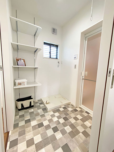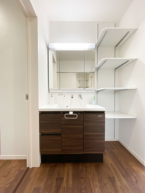 シャンプーのストックやバスタオルの収納に使える収納棚を設置しました。