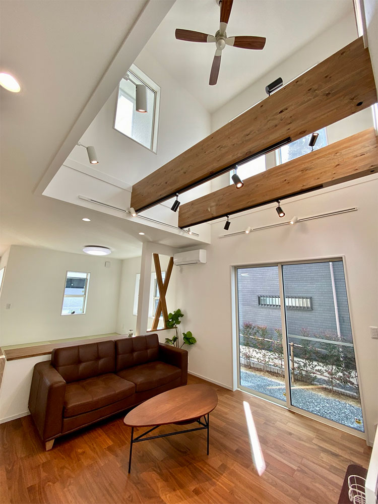 リビングに入った時に空間の広がりと印象的な天井に心躍る家