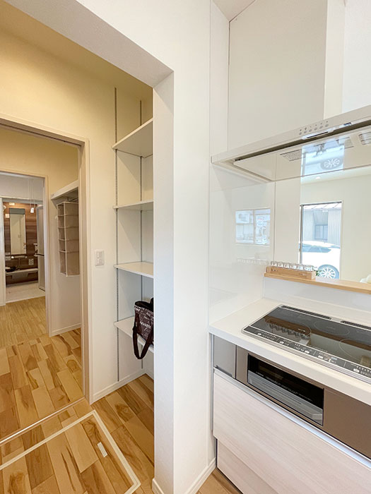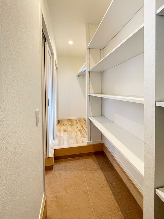 通り抜けが可能なパントリー。見える収納なので使い忘れも防げます。