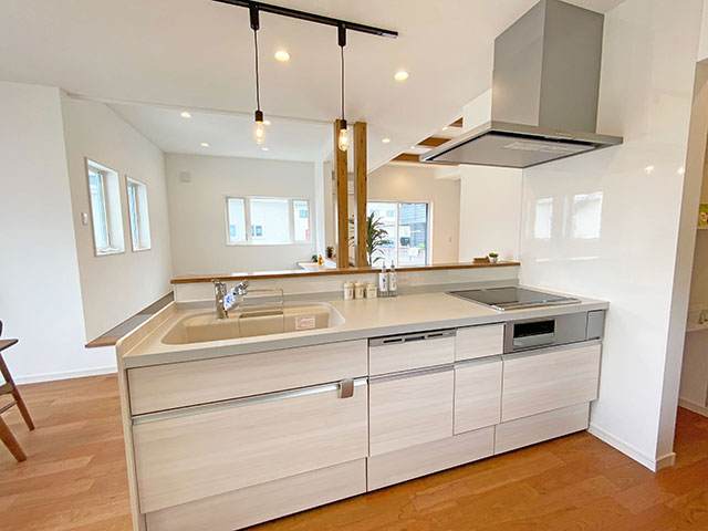 魅せるアイランドキッチン。白と黒のコントラストに、柔らかなグレーのフローリングが暮らしにドラマを生む。
