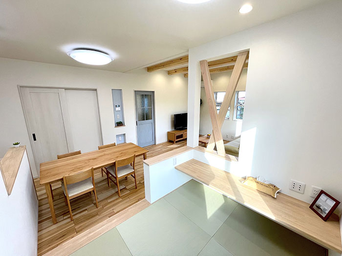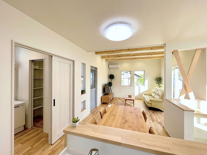 天井高2.7mのリビングに広々とした空間。化粧梁が木質感も創出。