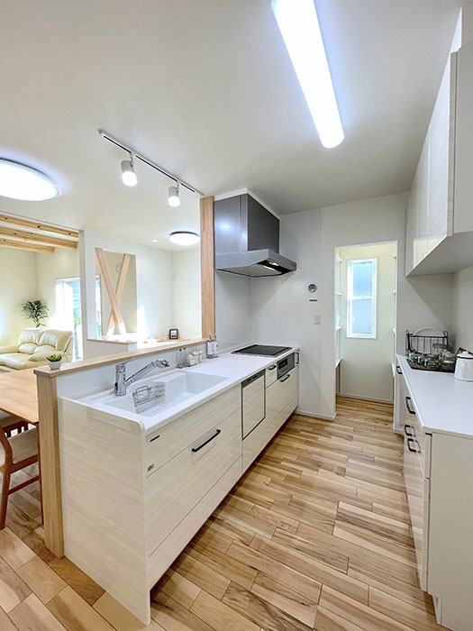 家事動線を考えキッチンからすぐにランドリーへ向かえるようにしました。