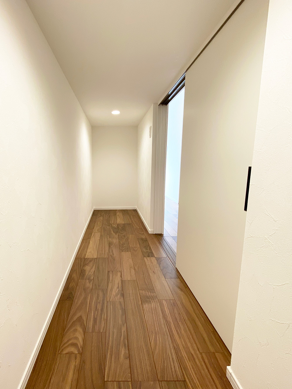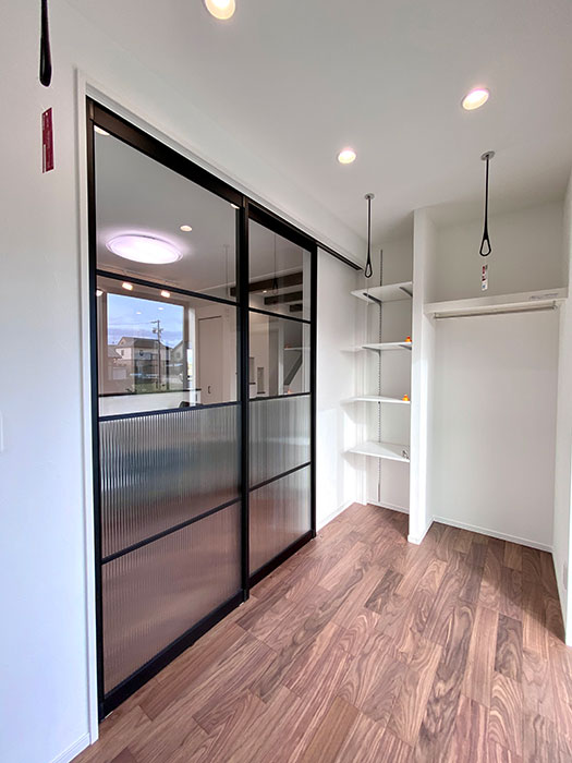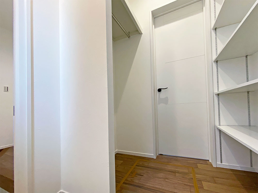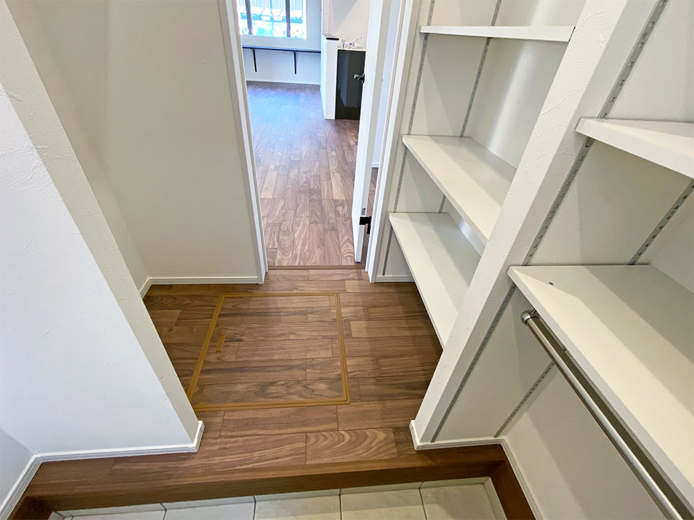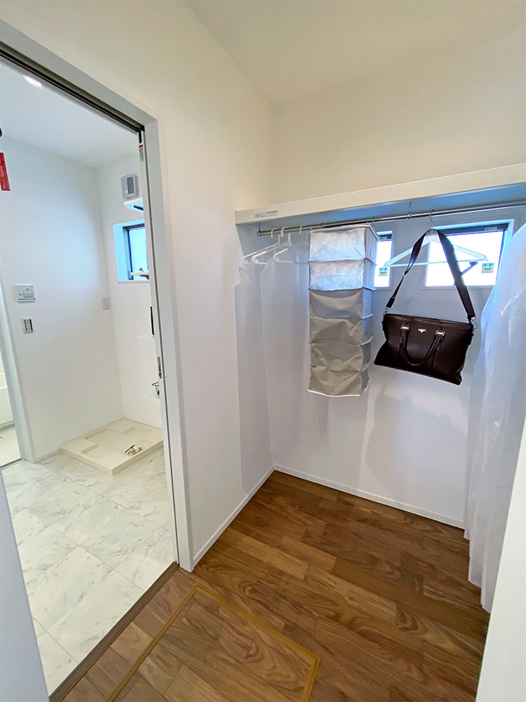 シューズクローゼットで靴を脱いでコートをかけてリビングへ向かえるので、玄関をきれいに保てます。