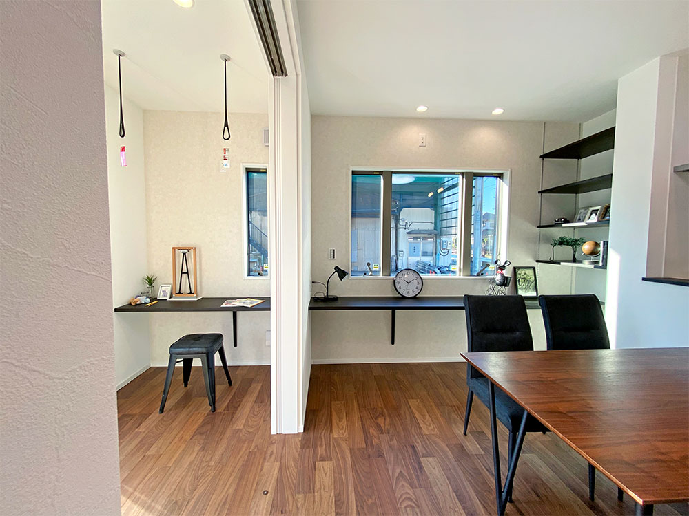 サンルームは、リモートワーク部屋としてもお使いいただけます。カウンターの反対には収納も設けています。
