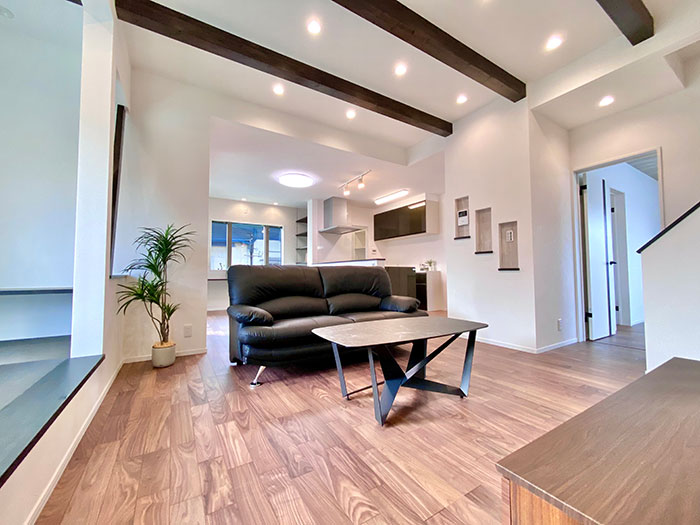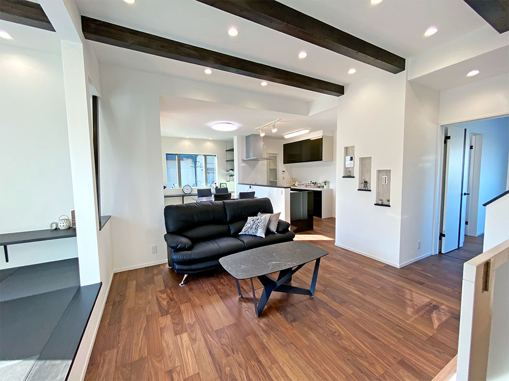 リビング上部の化粧梁で空間にアクセントをプラスしました。