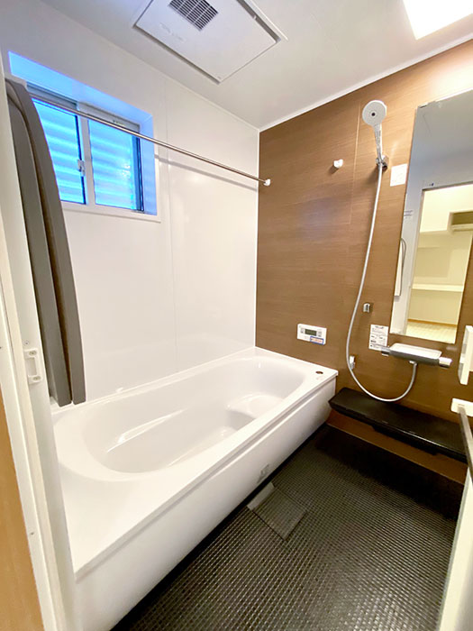 乾きやすく・カビにくくお手入れがラクな床に断熱材で包み込んだ魔法びん浴槽。浴室換気暖房乾燥機付き。
