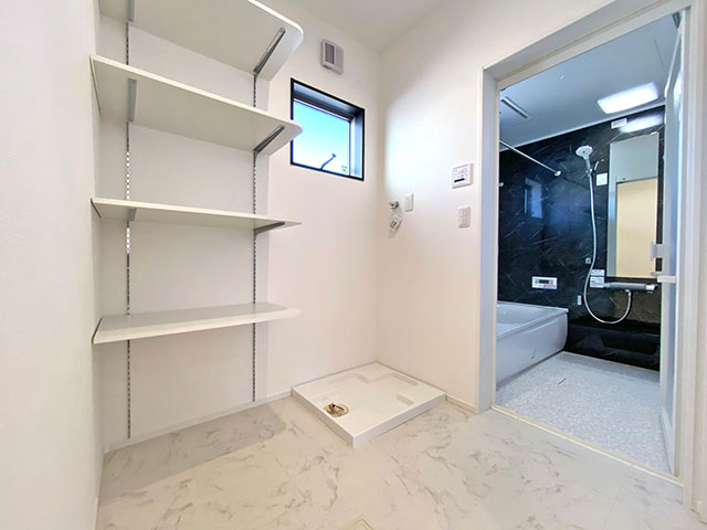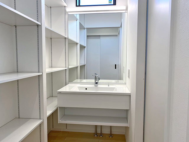 洗面と分かれているため、気兼ねなくお風呂に入れます。またここにも収納棚があるので、タオルやパジャマはここに収納すると便利です。