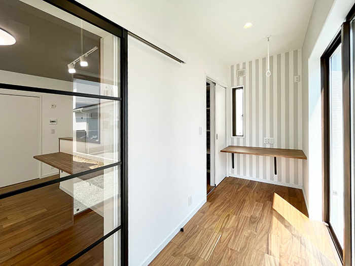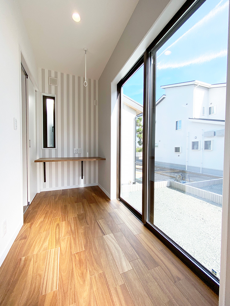 キッチンからもダイニングからも向かえるサンルーム!ここで洗濯物を干すのもあり!お仕事をするものあり!生活スタイルに合わせて使うことができる空間です。