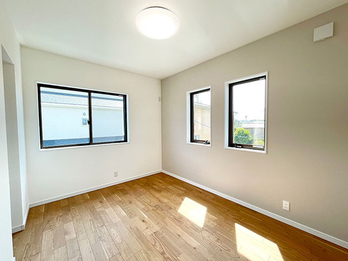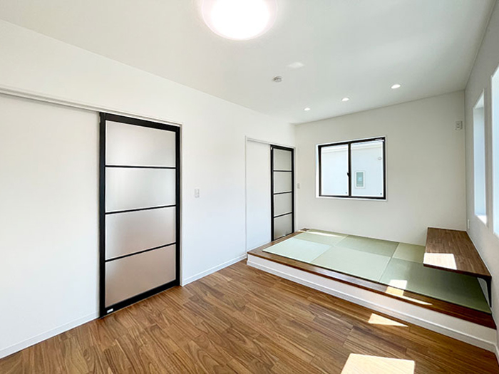 洋室と和コーナーがコラボしたお部屋!寝室としてもあり!和コーナーで子どもがお昼寝している間に様子を見ながら仕事をする、お仕事部屋としても最適です。ドアは2か所設置しているので、将来的に建具で仕切って2部屋別の使いかたにもできちゃいます。
