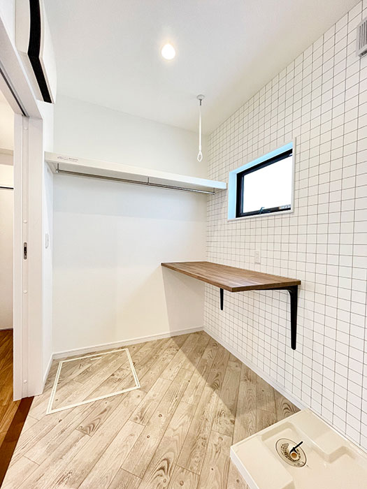 ランドリーでは、洗濯物が干せるように室内物干しを設置しました。またちょっとしたパジャマなどは掛ける収納ができるようにハンガーパイプを完備。アイロンがけやタオル置き場にと広めのカウンターもつけました。