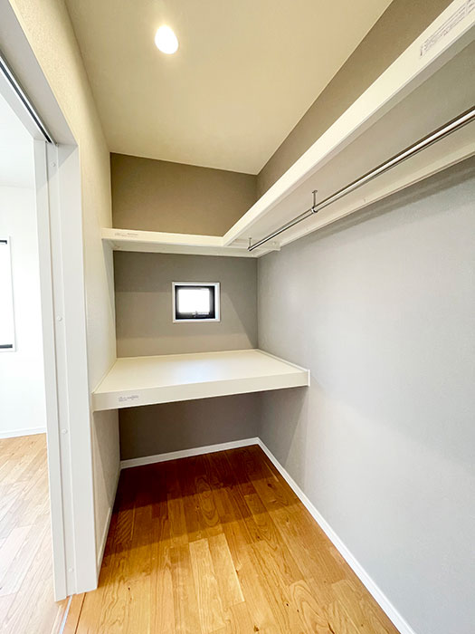 腰高の大きな棚とハンガーパイプのある大型収納。アクセントクロスを施して、見ええないところにも手を抜いていません。