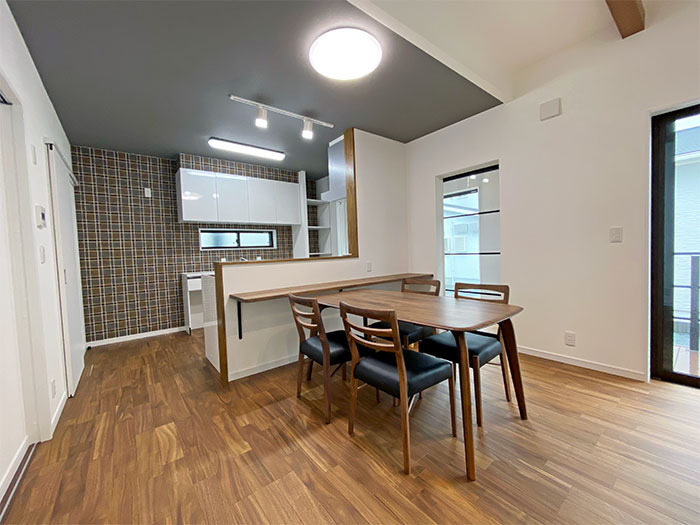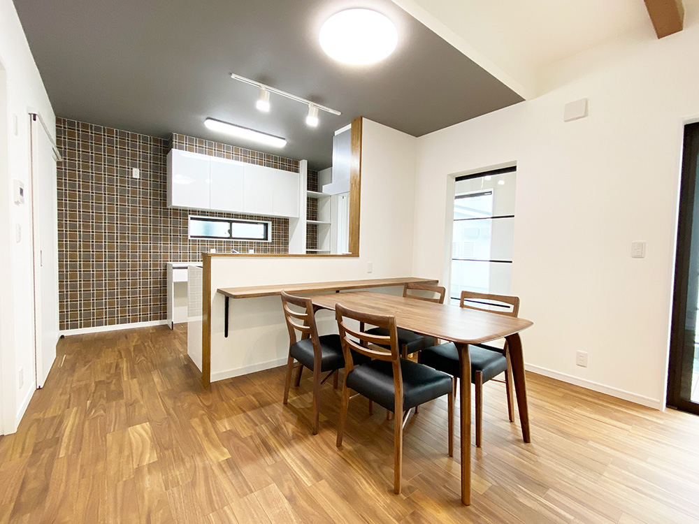 カウンター付きのダイニング。天井のクロスも落ち着き感を演出!サンルームとキッチンの回遊ができる扉もアイアンガラスで手を抜かないです。