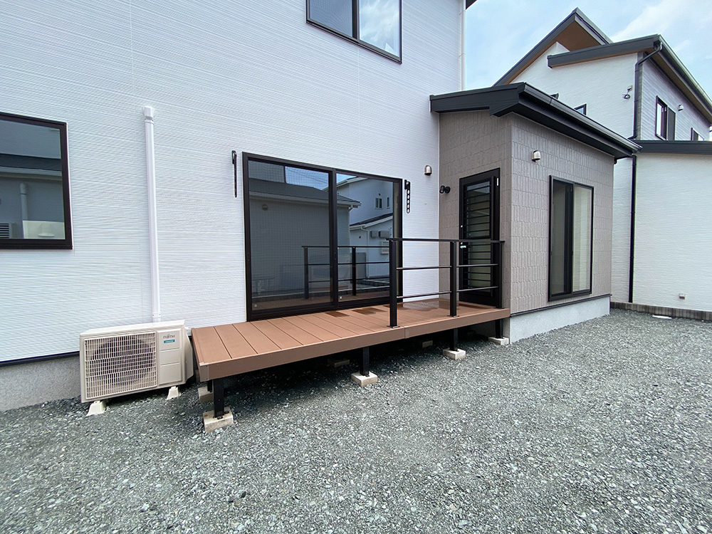 洋室&和コーナーコラボ部屋のあるお家!サンルームとウッドデッキが横並びになっている行き来がストレスフリーな間取り