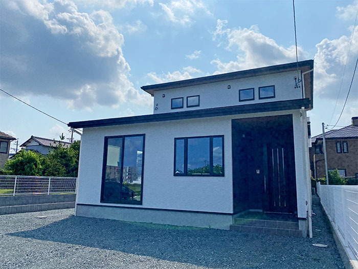 ホワイトカラーの外壁とアクセントの妻飾りが可愛らしい外観