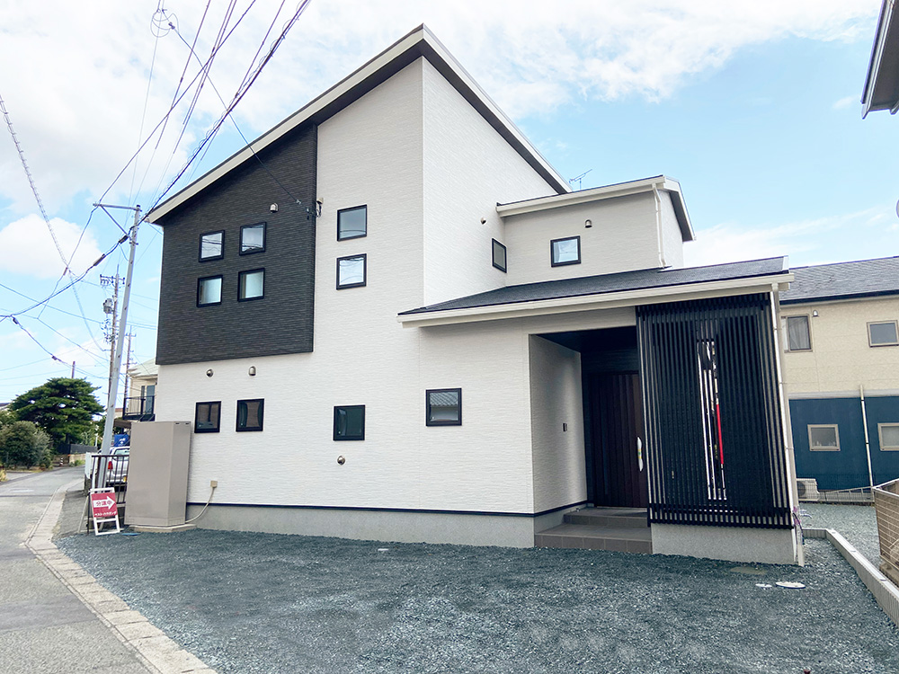 玄関まわりの外壁を黒系にして奥行きがでる工夫をしました。