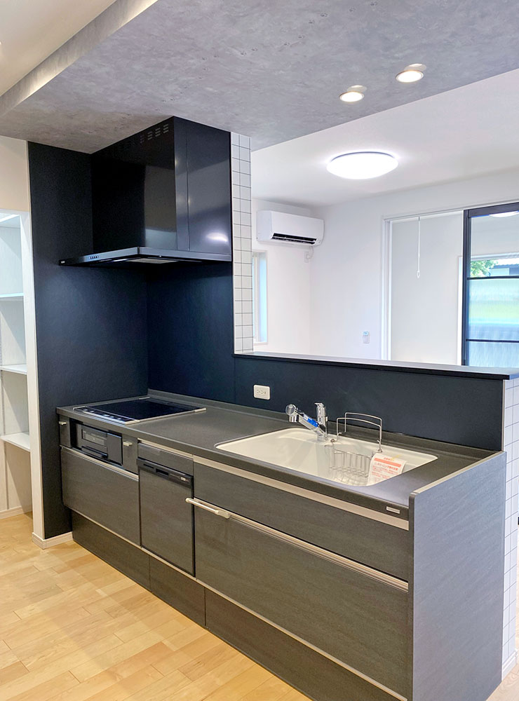 キッチンやドアの金物などにアクセントとしてブラック系を入れました