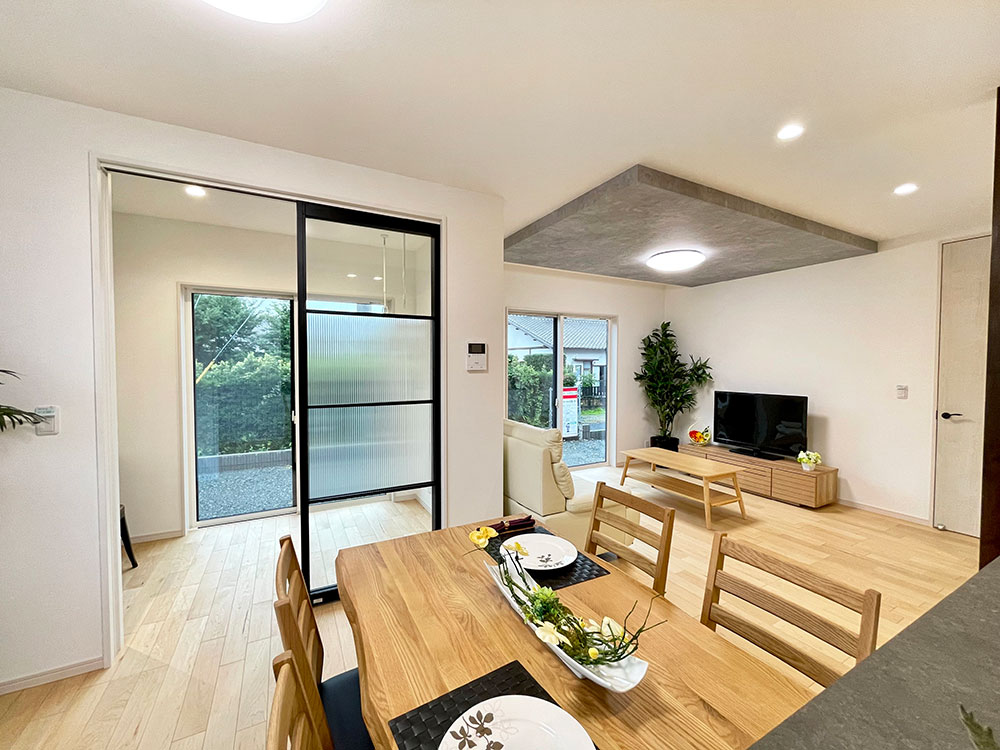 ダイニング側にドアガラスの引き戸、リビング側に窓を設置したので閉塞感がありません。
