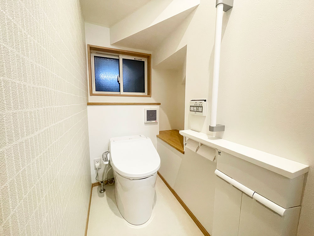 ホワイトを基調とした明るい印象のトイレです。手すり付きなので立ち座りも安心!