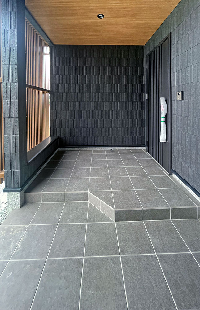 屋根付き玄関と勾配天井が特徴的な和モダンテイストのお家