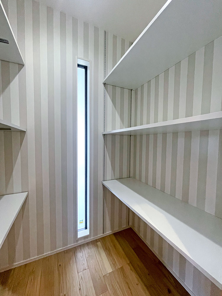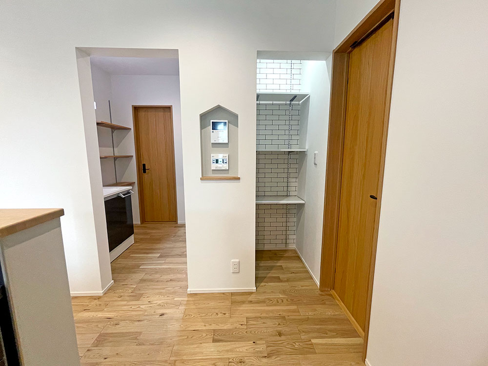 来客モニターなどもキッチン横にあるのですぐに確認ができてストレスフリー。写真右側はパントリーです。