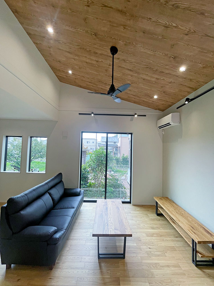 リビング空間を勾配天井とし、天井を高くすることで開放感とデザイン性を考えました。