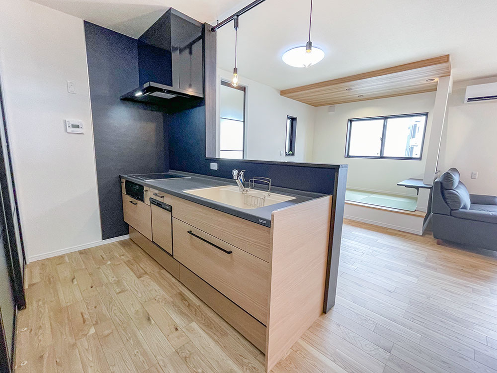 キッチンからリビング、ダイニング、和コーナーの様子が見渡せる子育て安心な住まい