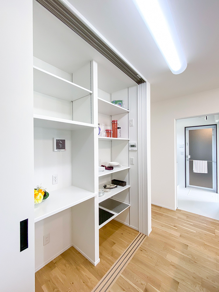 - キッチンの後ろにはたっぷり収納できるスペースを設けました。電子レンジやミキサーなどを隠してスッキリ見せることができます。