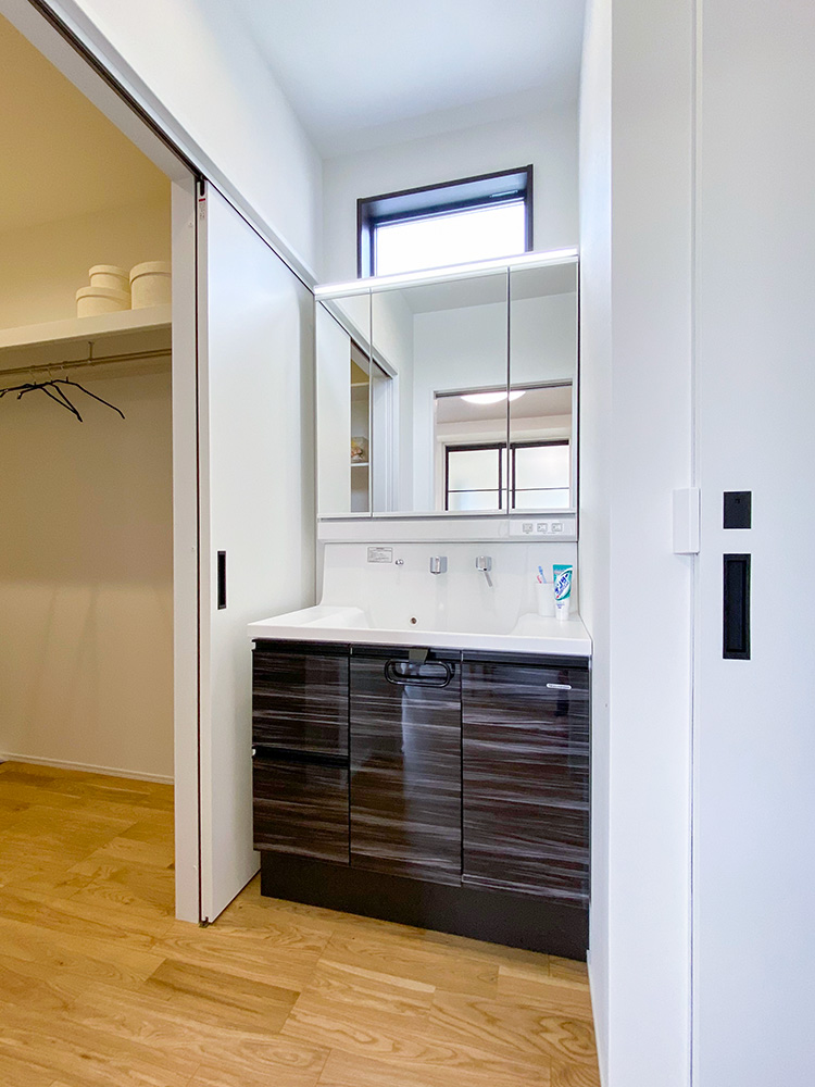 - 脱衣室から独立させた使い勝手の良い洗面化粧台です。家族が入浴中でも気兼ねなく使うことができます。