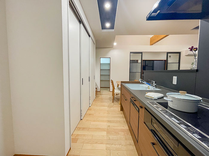 - キッチンは通り抜けOK。大型収納で家電や食器、パントリーとしての機能も入っています。