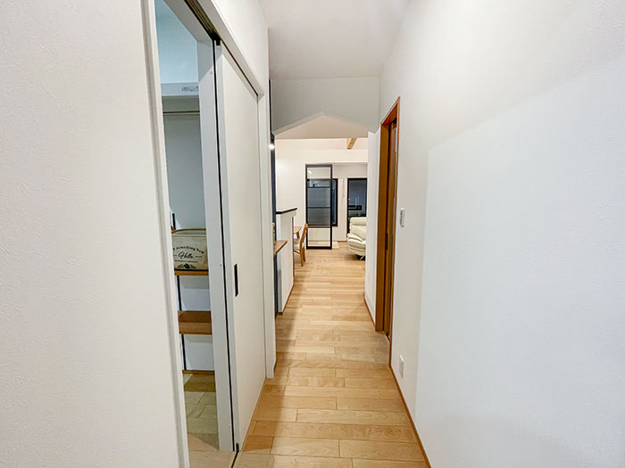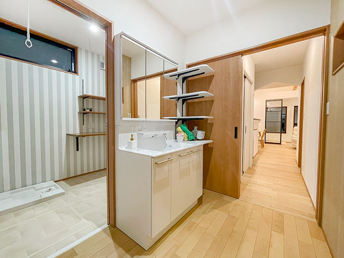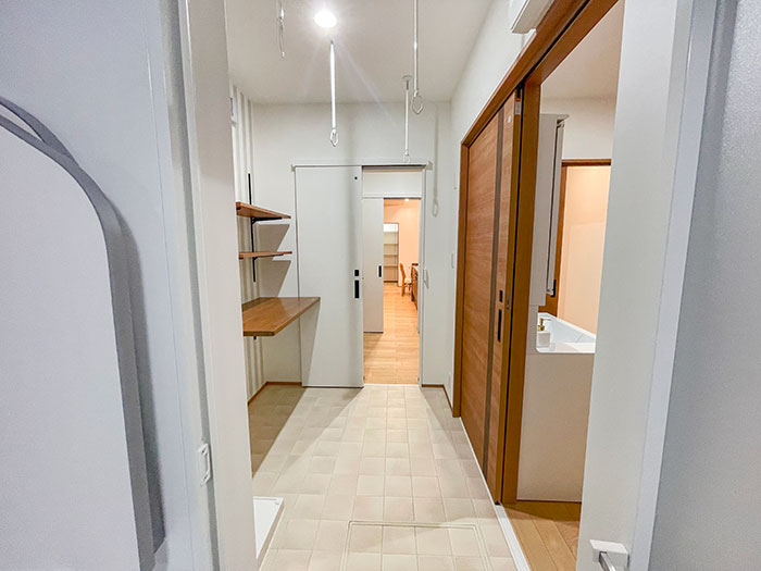 - シューズクローゼットを抜けると、写真奥にリビング・写真手前に手洗いできるスタイリングエリア。写真左手に洋服収納できるファミリークローゼット
